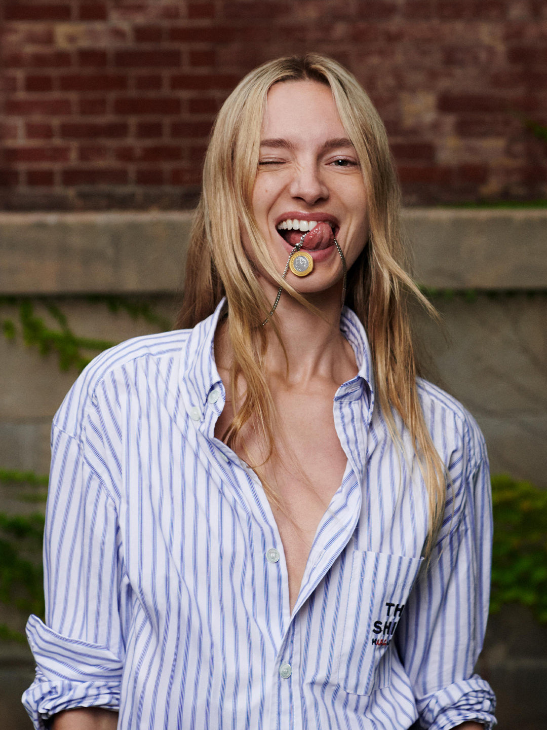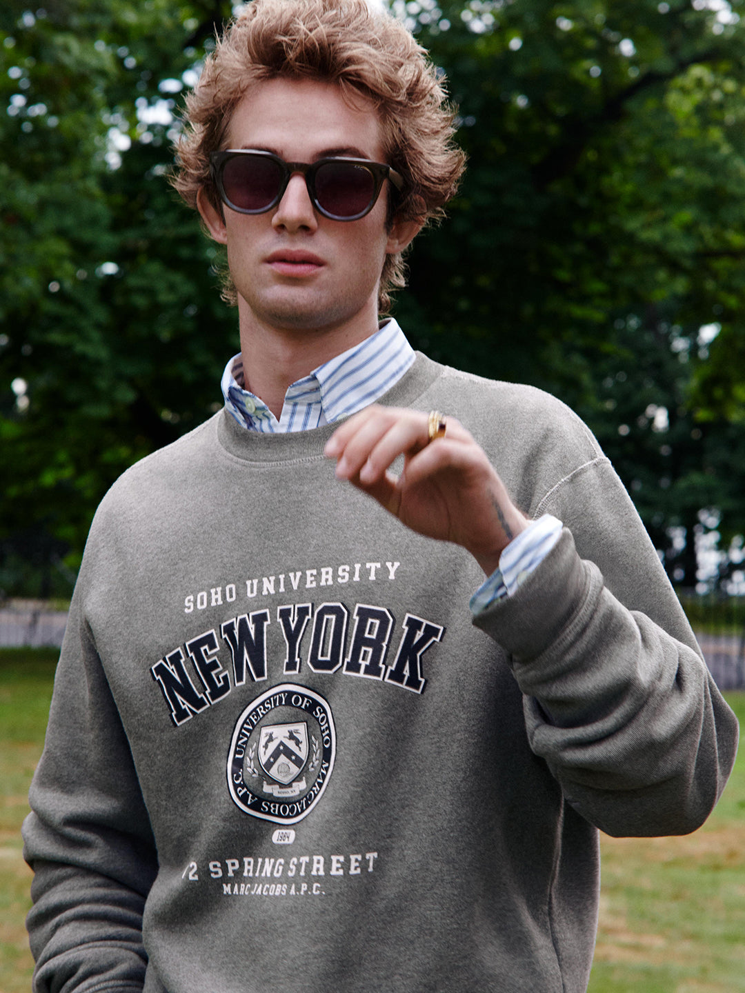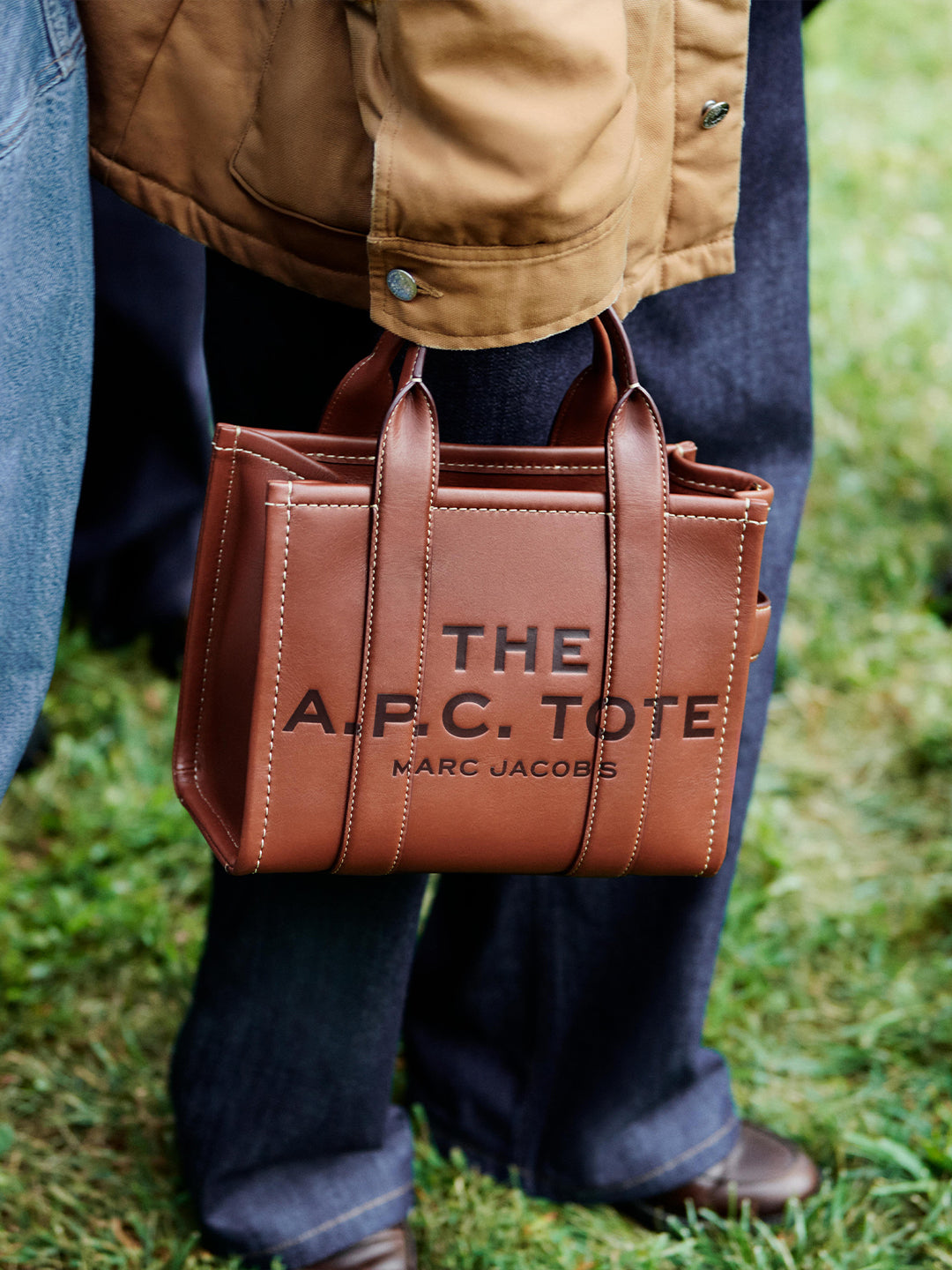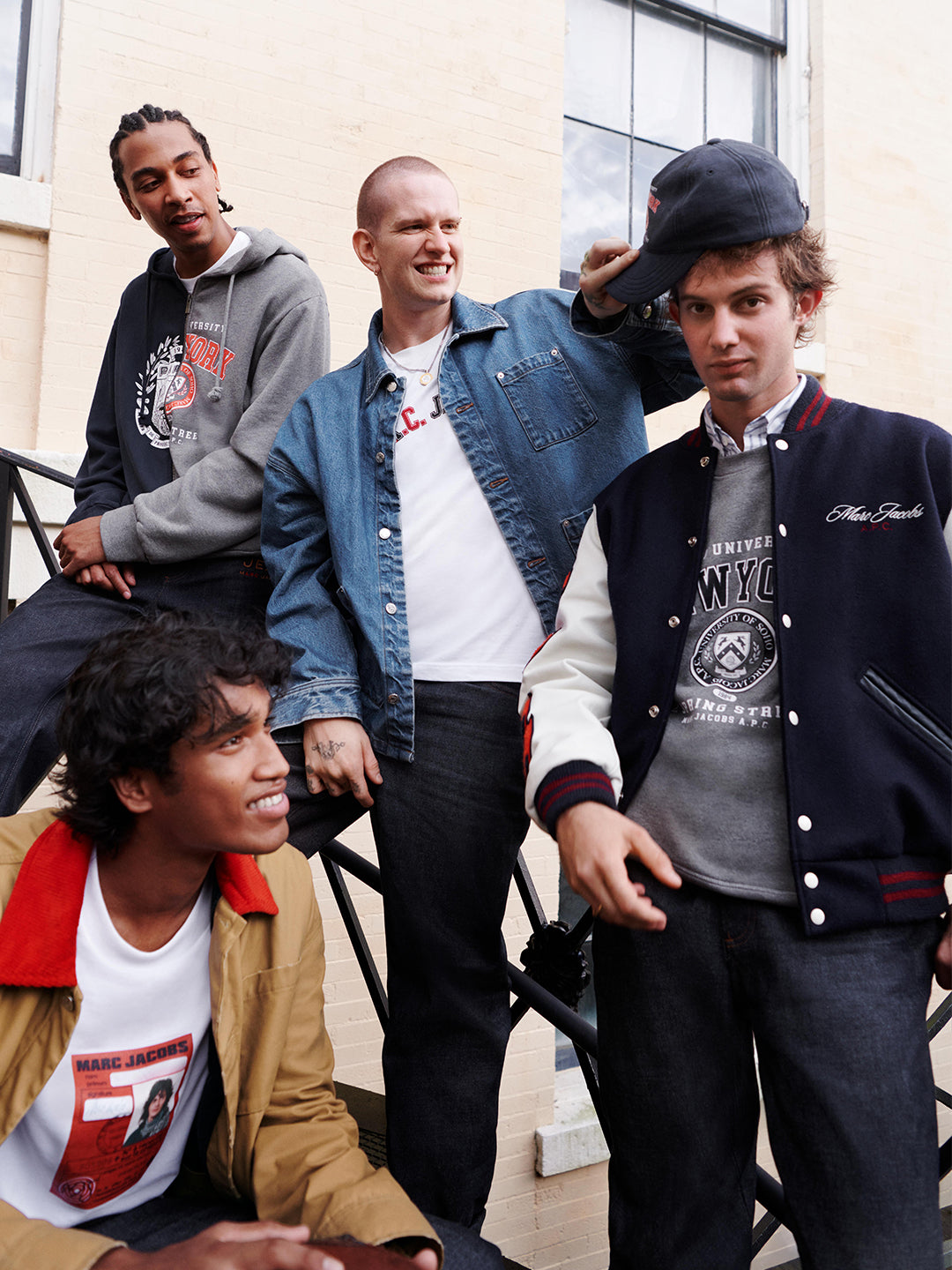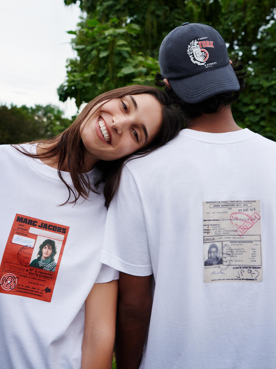 The collection unites two “universities” of style, with Marc Jacobs and A.P.C. crests featured on key pieces and signature embroidery and embossing appearing throughout, including a varsity jacket in wool and cowhide and dual-branded jerseys. Men’s and women’s essentials range from denim jeans (“THE JEAN”), miniskirts (“THE SKIRT”), and a slightly baggy striped shirt (“THE SHIRT”) to Marc Jacobs’ Tote Bag and a collector’s edition of A.P.C.’s Demi-Lune.