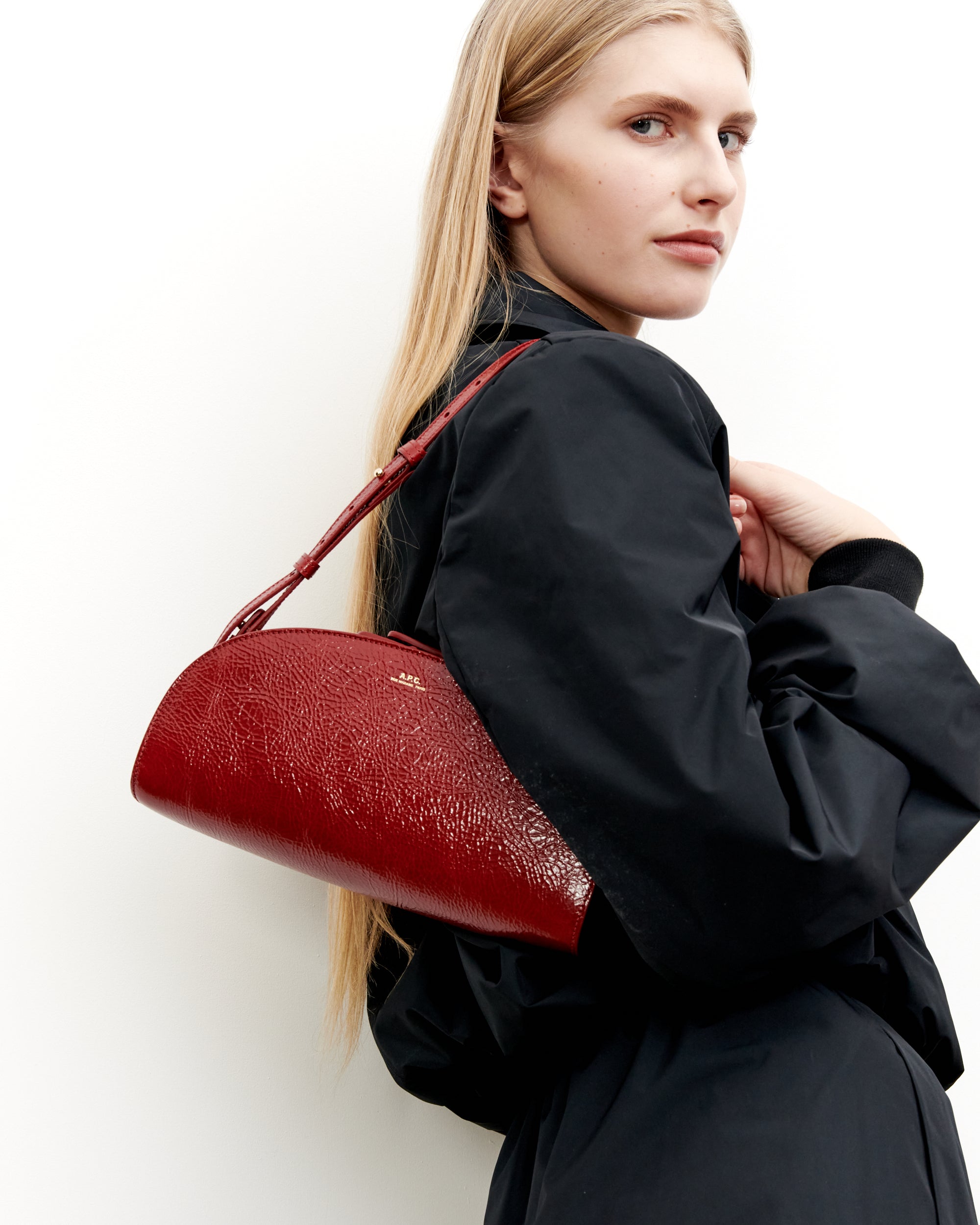 Demi-Lune bag in red crinkled leather in a longer version.