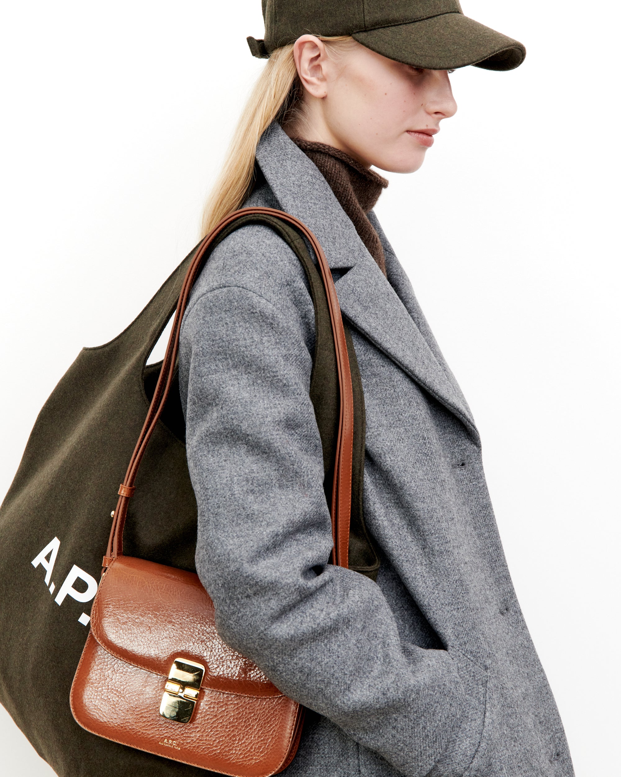 Unisex horizontal tote bag in reversible khaki and black with the A.P.C. logo.