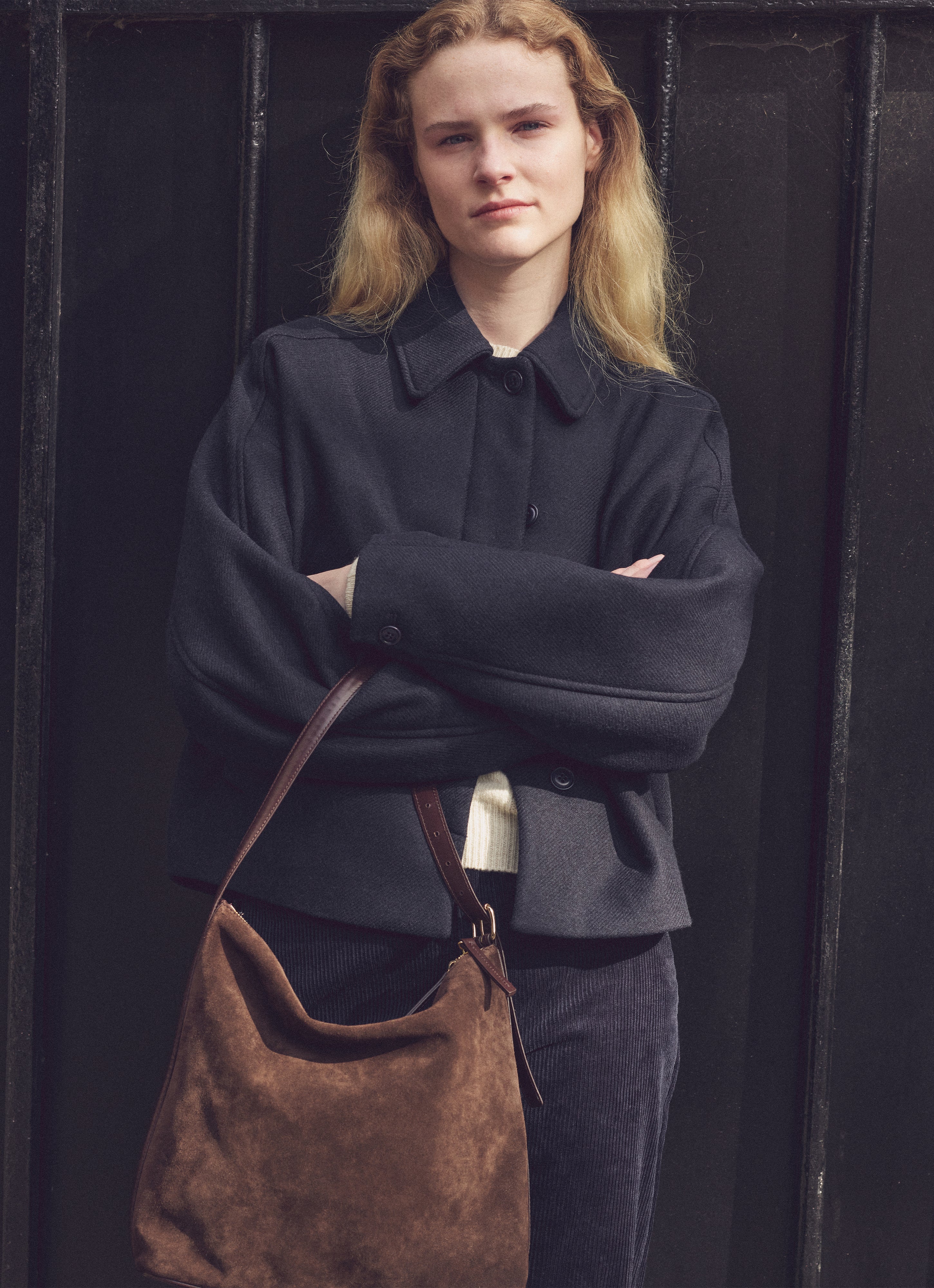 Large square shoulder bag in dark chestnut brown suede and smooth leather.